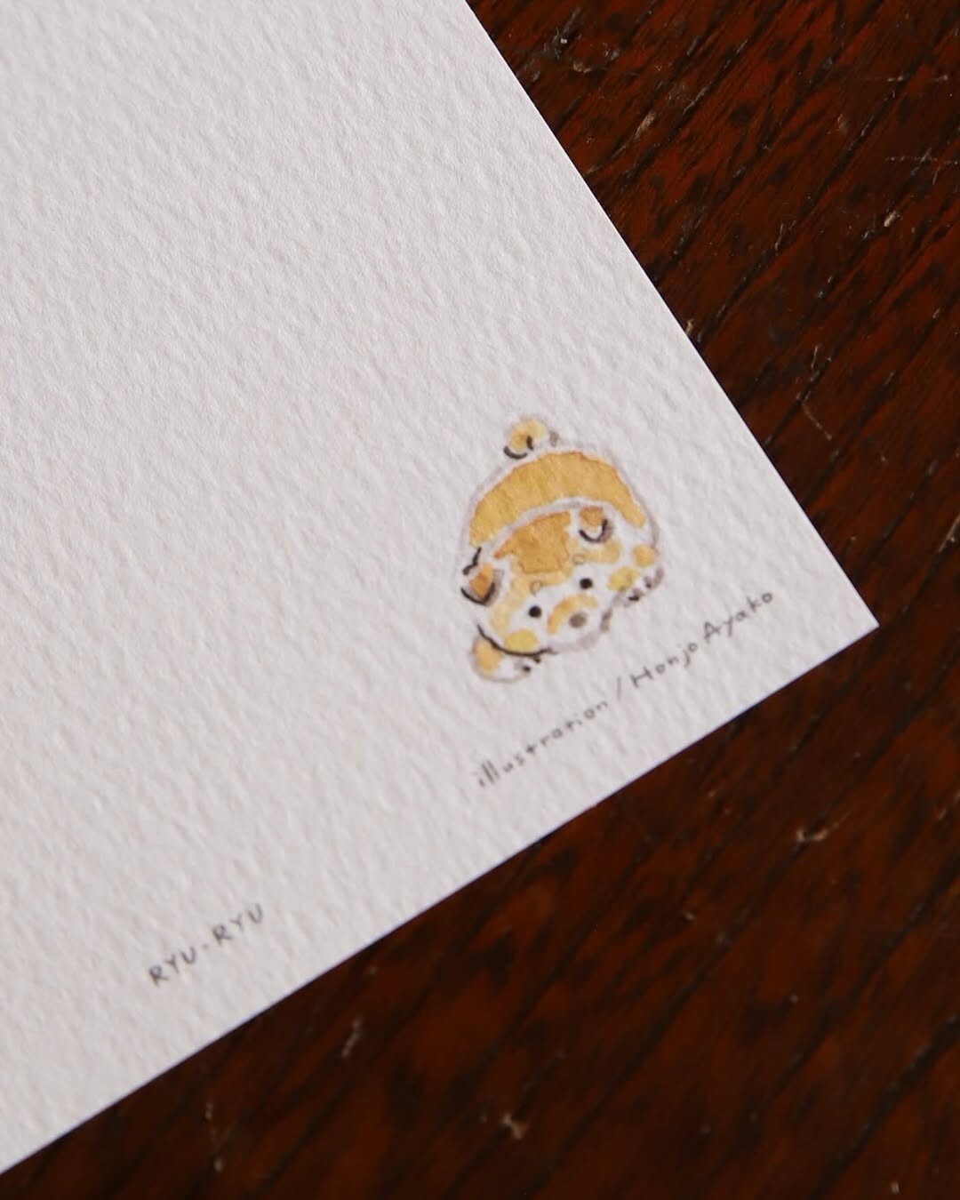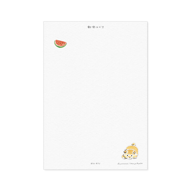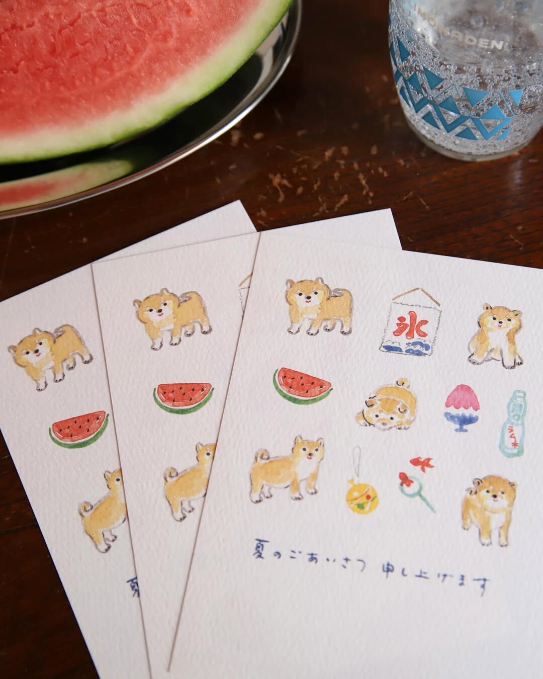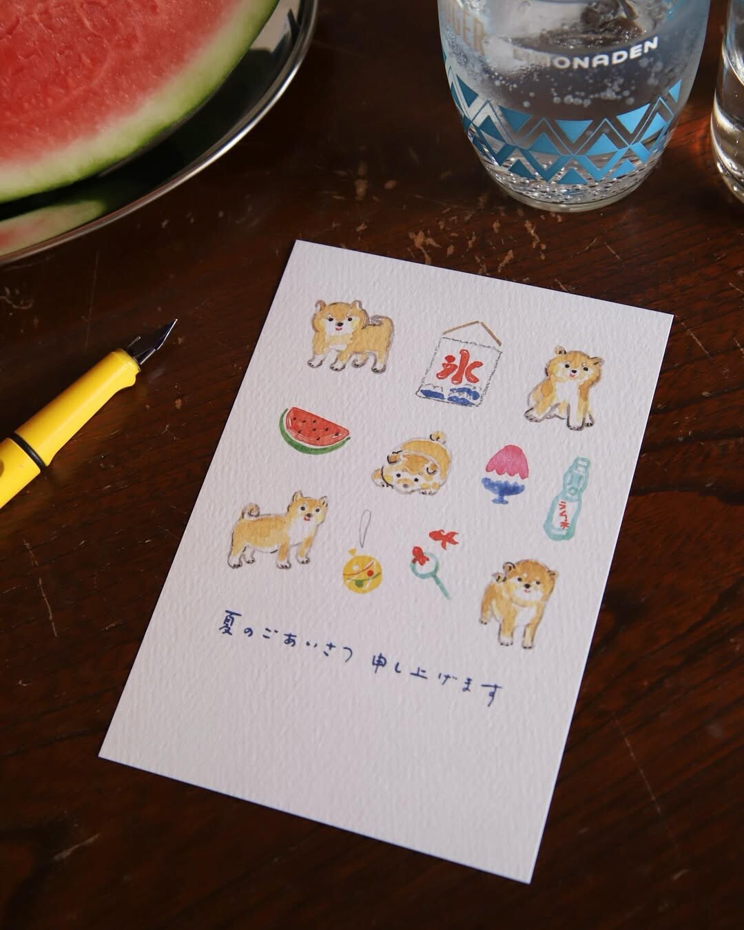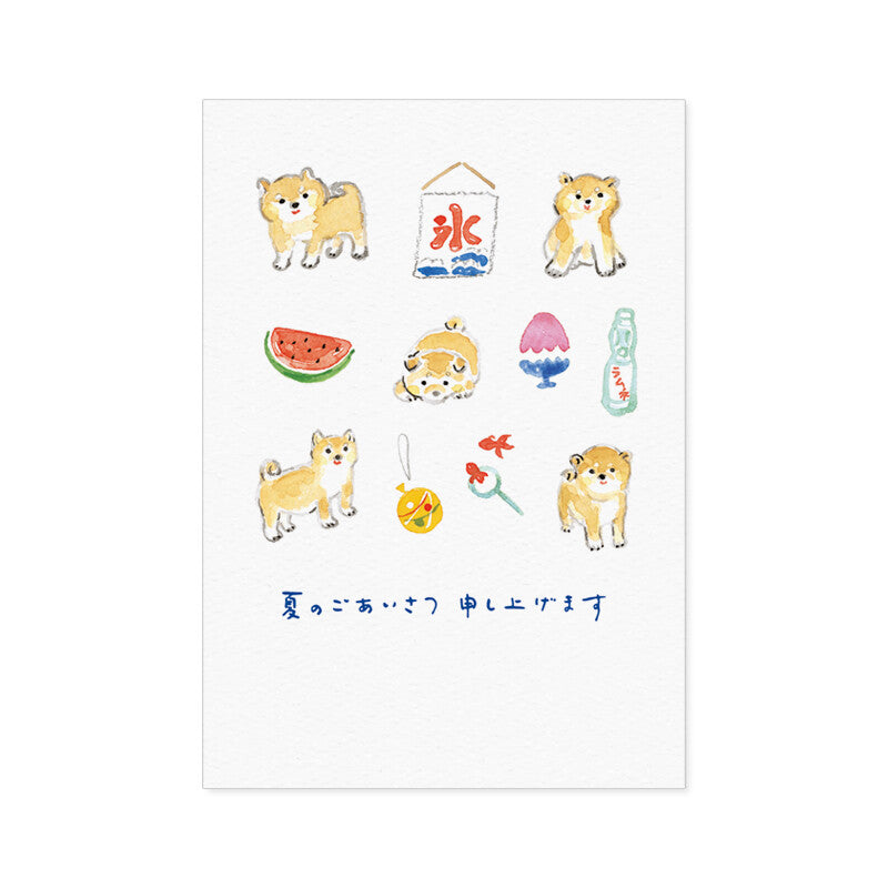 - Postal con ilustración de perritos shiba en un ambiente veraniego.