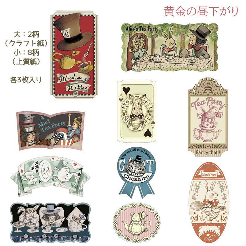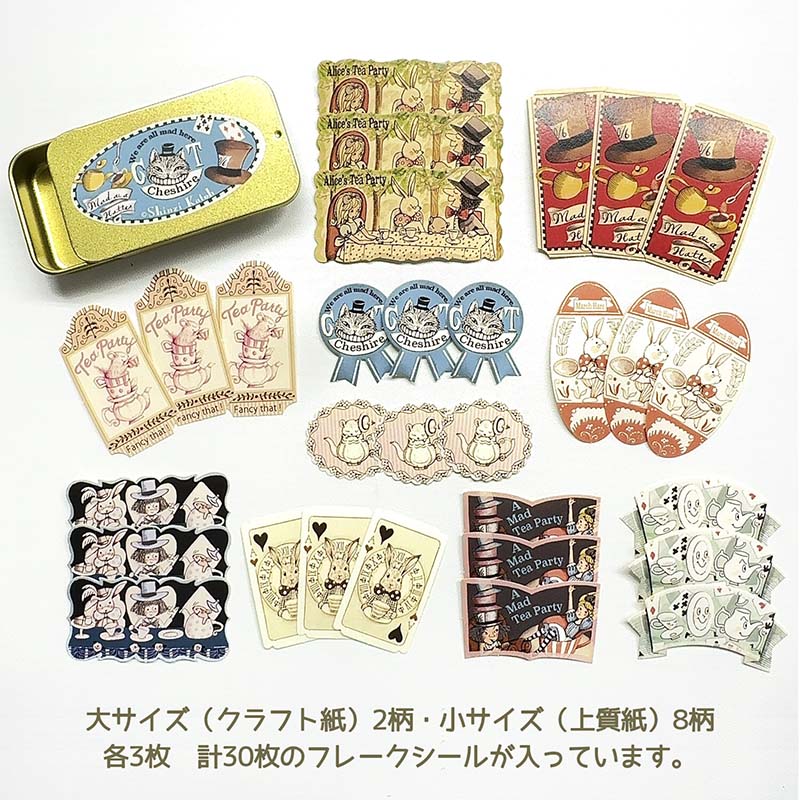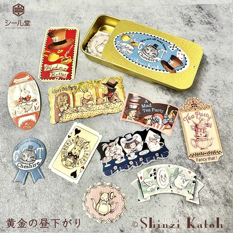 - Pegatinas con estampado de Alicia en el País de las Maravillas en una cajita de metal.
