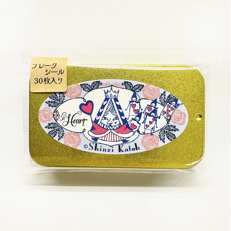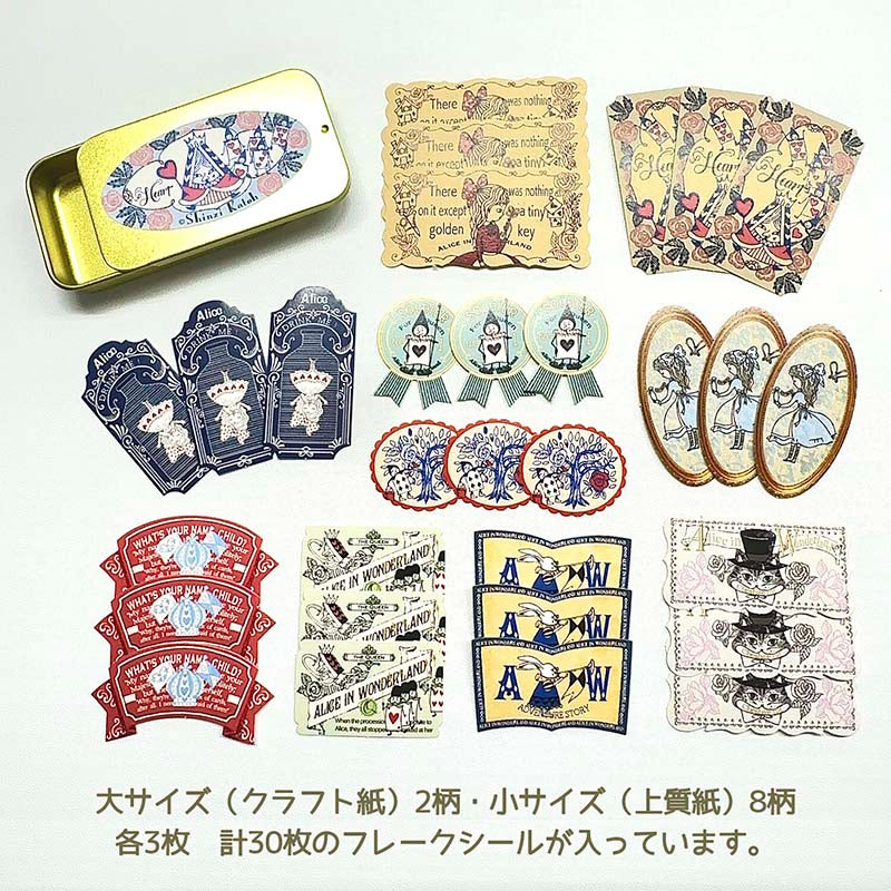 - Pegatinas con estampado de Alicia en el País de las Maravillas en una cajita de metal.