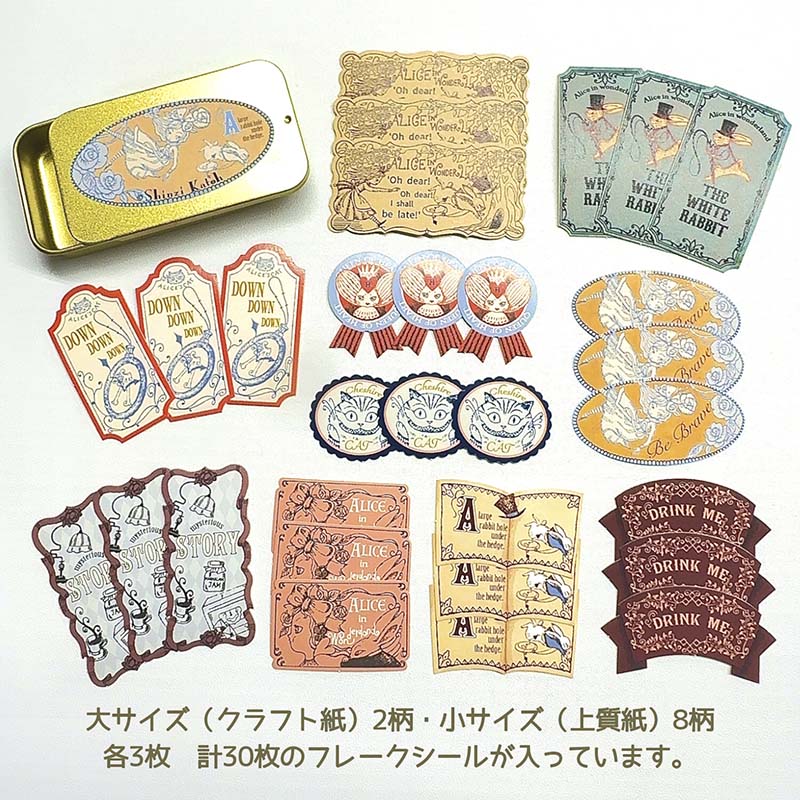 - Pegatinas con estampado de Alicia en el País de las Maravillas en una cajita de metal.